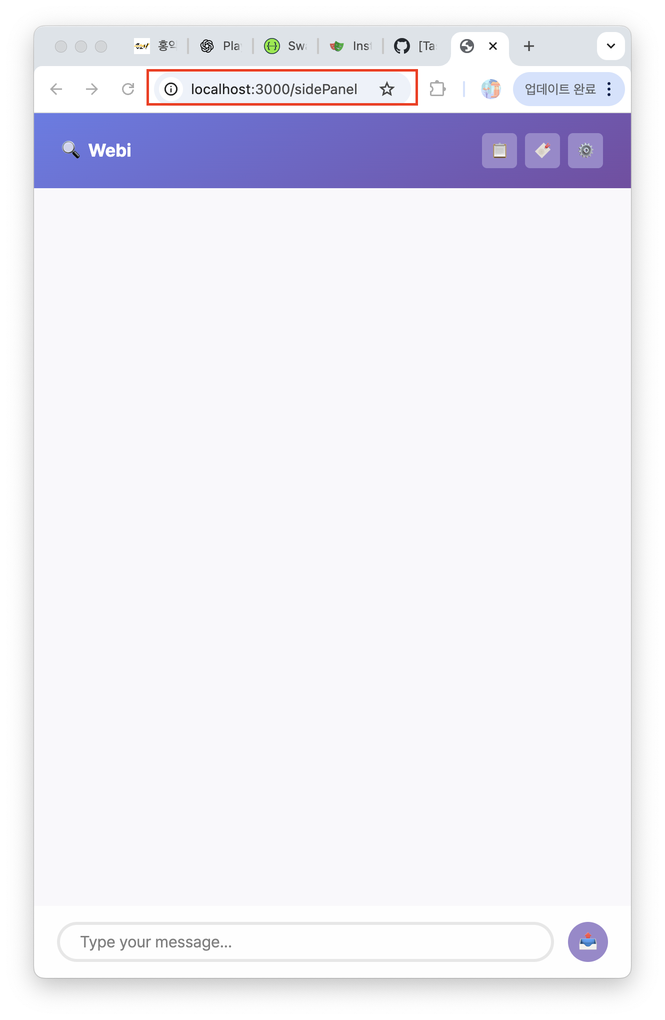 사이드 패널 페이지로 가서, 사이드 패널의 헤더에 Webi 제목이 보이면 사이드 패널이 잘 렌더링되었다고 볼 수 있다.