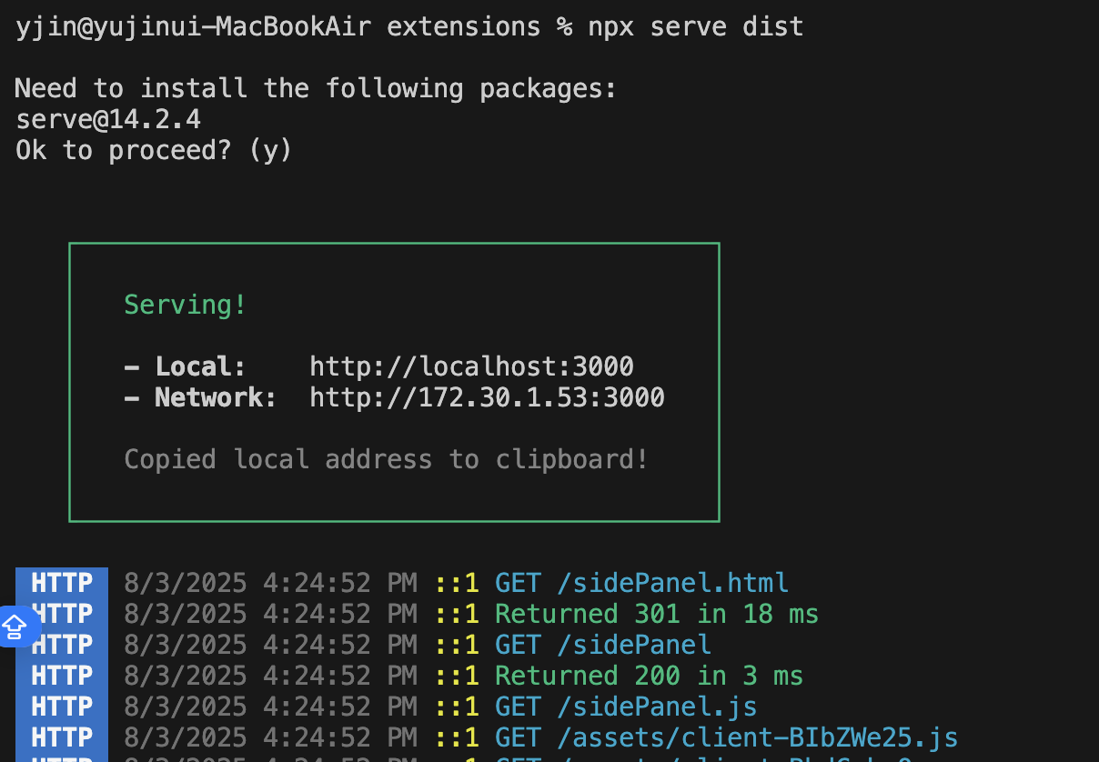 아까 실행했던 serve 서버를 중단해놓고 있었더니, `http://localhost:3000/sidePanel.html`으로 갈 수 없다고 나왔다.