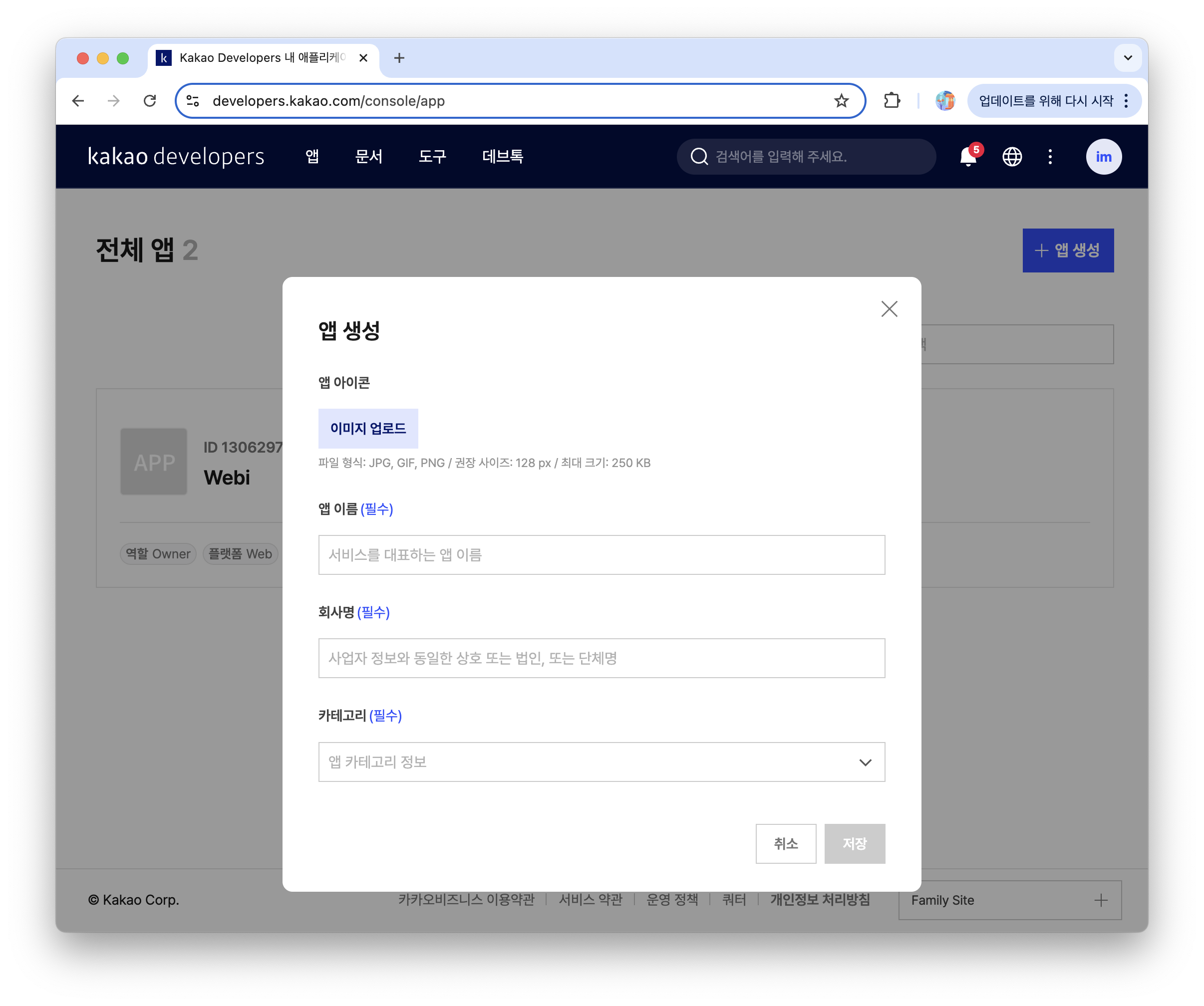 2. 앱 카테고리에서 `+앱 생성`을 클릭해 나의 서비스 앱을 추가한다.