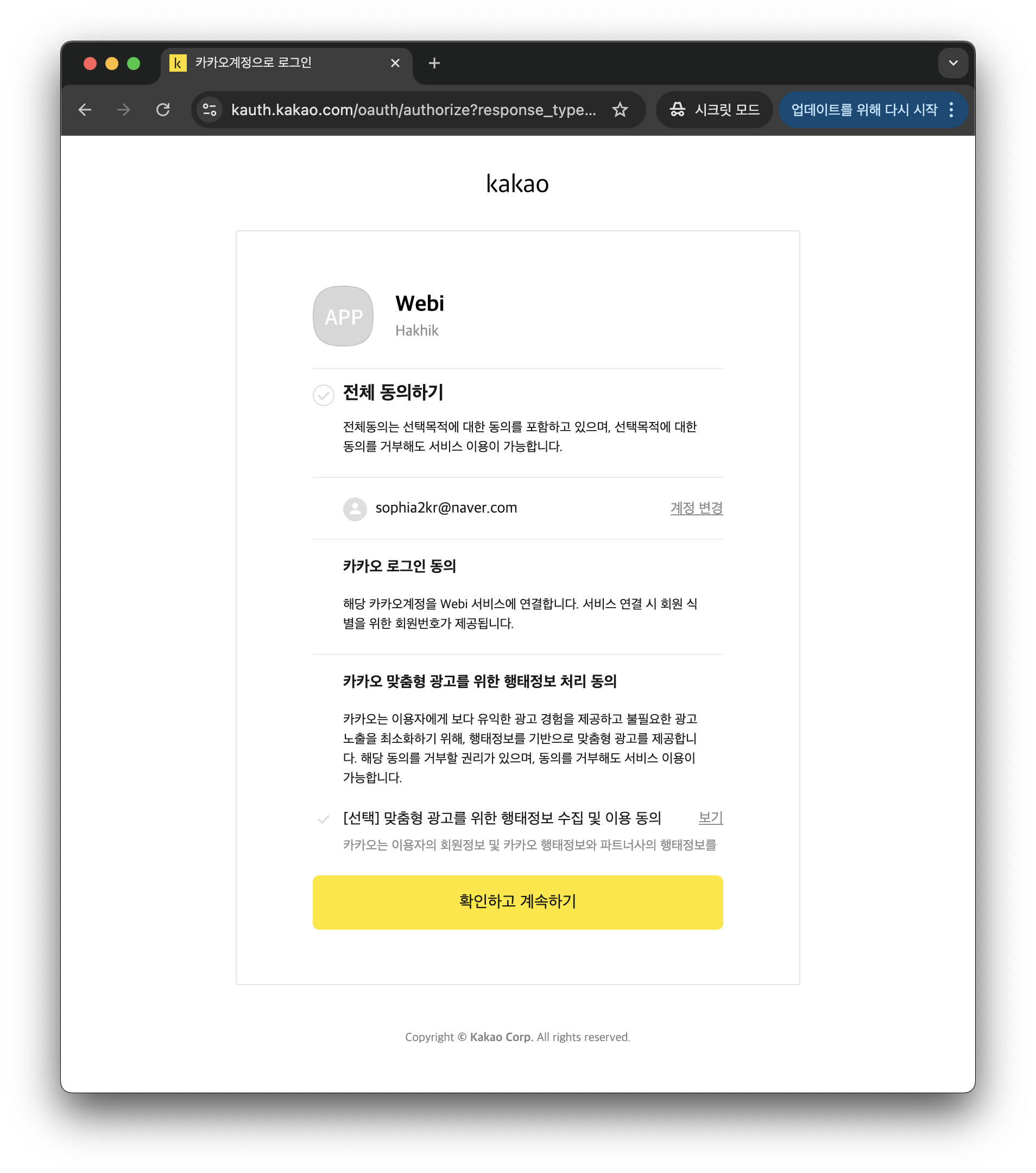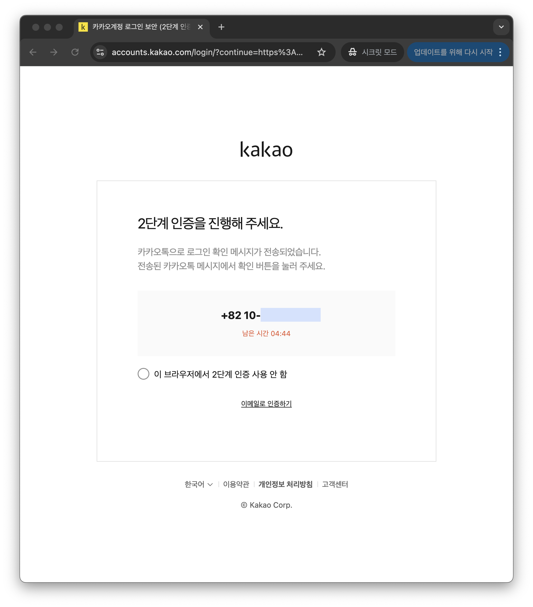 카카오 계정을 입력하고 인증을 완료한다.