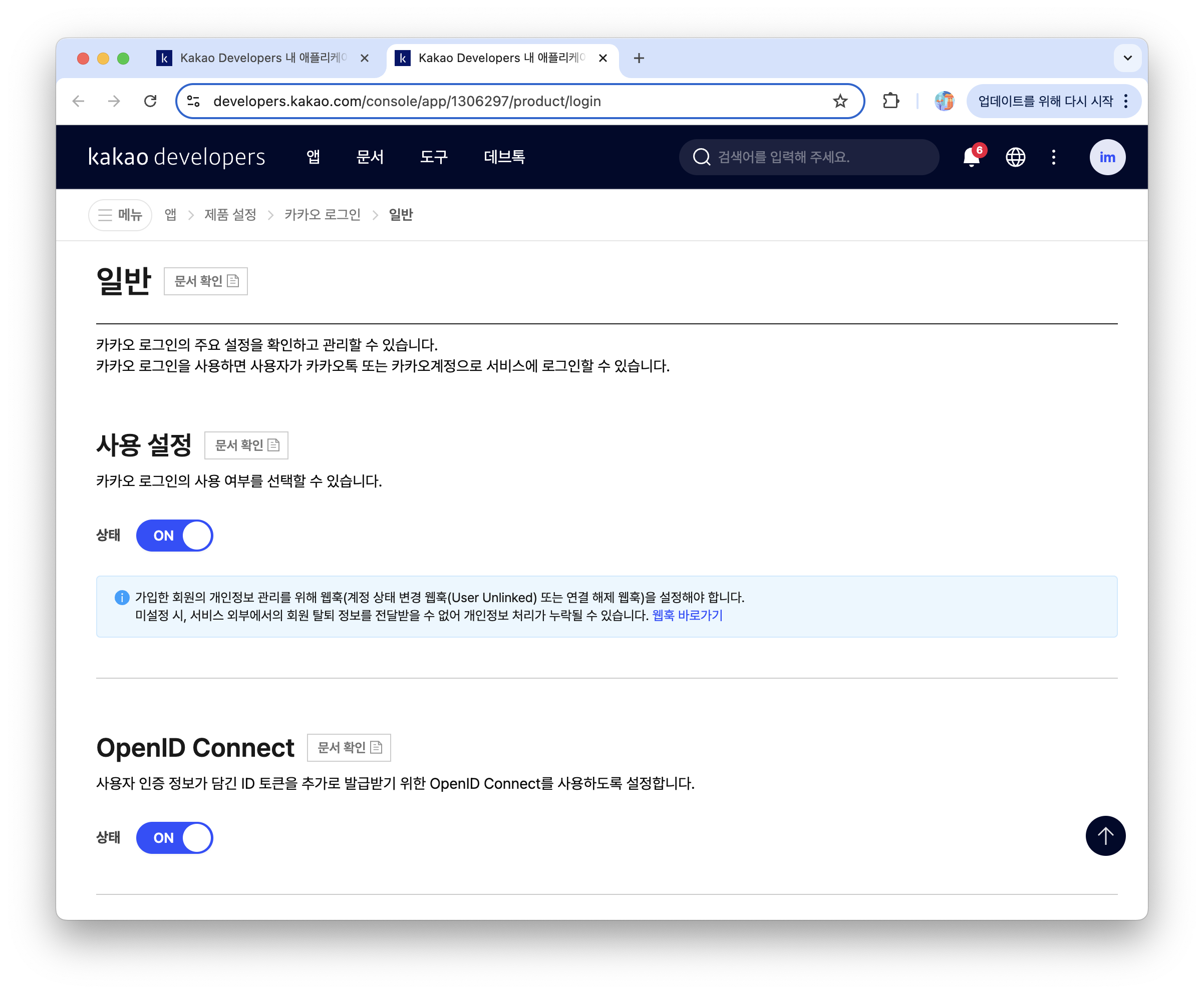 3. [앱 > 제품 설정 > 카카오 로그인 > 일반] 에 들어가서 카카오 로그인 설정을 한다.