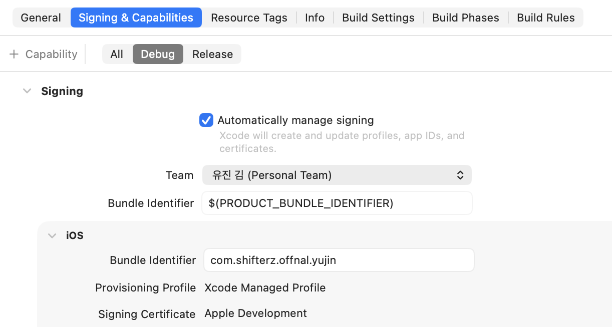 같은 프로젝트라도 다른 개발자라면 다른 development team과 bundle identifier로 앱을 빌드하게 된다.